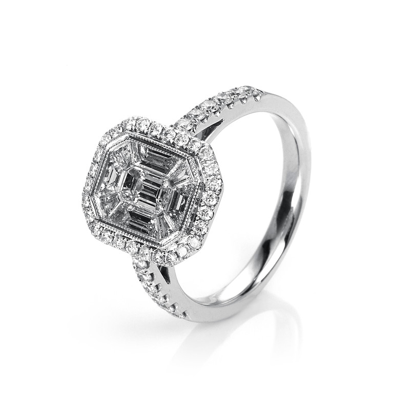 ring 18 kt WG, 9 baguette 0,98 ct, G-si, 40 diamonds 0,48 ct, G-si, width:54