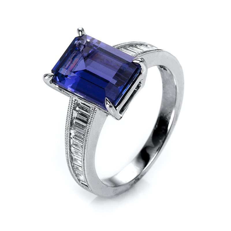ring 18 kt WG, 14 baguette 0,80 ct, G-si, 1 tanzanite 4,46 ct blue, h:9,5 mm, w:11,8 mm, width:54