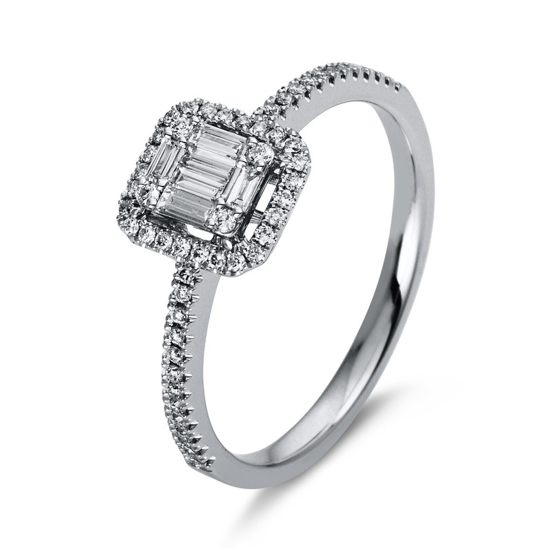 ring 18 kt WG, 6 baguette 0,08 ct, G-si, 54 diamonds 0,14 ct, G-si, width:53
