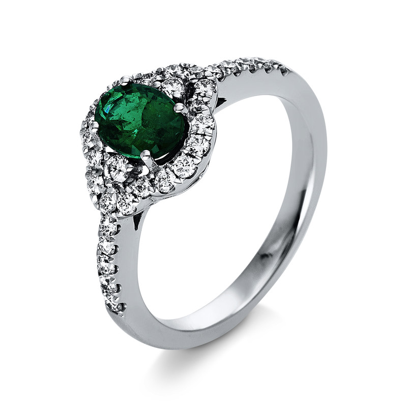 ring 18 kt WG, 30 diamonds 0,43 ct, G-vsi, 1 emerald 0,82 ct green, width:54