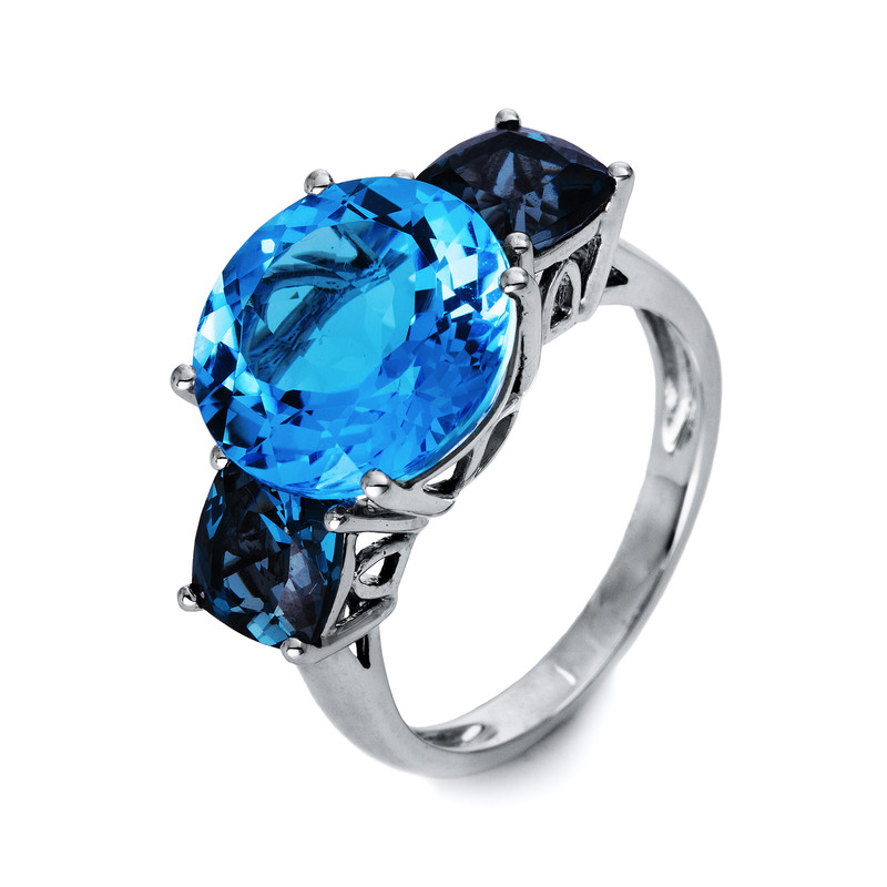 ring 18 kt WG, 1 blue topaz 8,30 ct blue, 2 blue topaz 2,50 ct Lond. blue, h:21,2 mm, w:12,0 mm, width:54