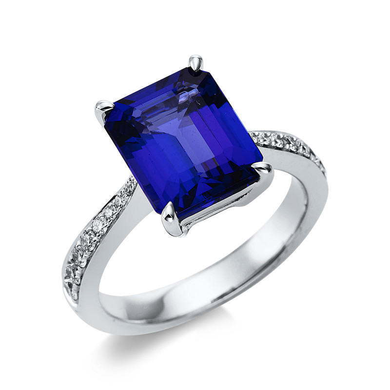 ring 18 kt WG, 16 diamonds 0,29 ct, G-si, 1 tanzanite 4,73 ct blue, h:9,2 mm, w:11,9 mm, width:54
