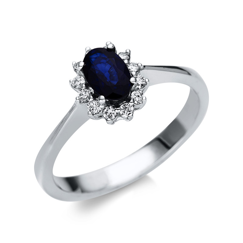ring 18 kt WG, 12 diamonds 0,16 ct, G-vsi, 1 sapphire 0,52 ct blue, width:53