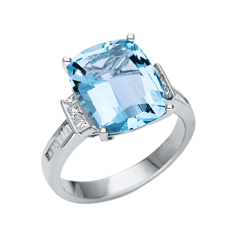 ring 18 kt WG, 6 princess 0,20 ct, G-si, 16 baguette 0,13 ct, G-si, 1 aquamarine 5,43 ct blue, width:54