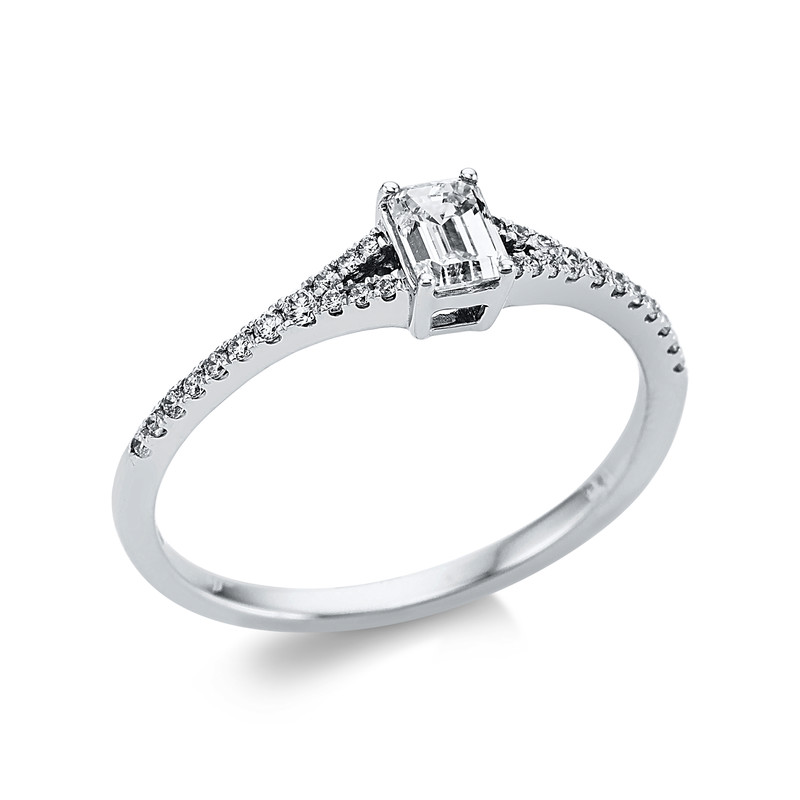 ring 18 kt WG, 1 em.cut 0,31 ct, G-si, 28 diamonds 0,12 ct, G-si, w:4,6 mm, width:54