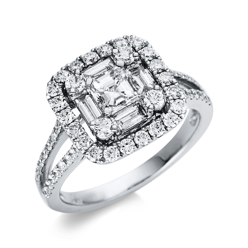 ring 18 kt WG, 4 tapers 0,31 ct, G-vsi, 1 assher cut 0,59 ct, G-vsi, 58 diamonds 0,78 ct, G-vsi, width:53