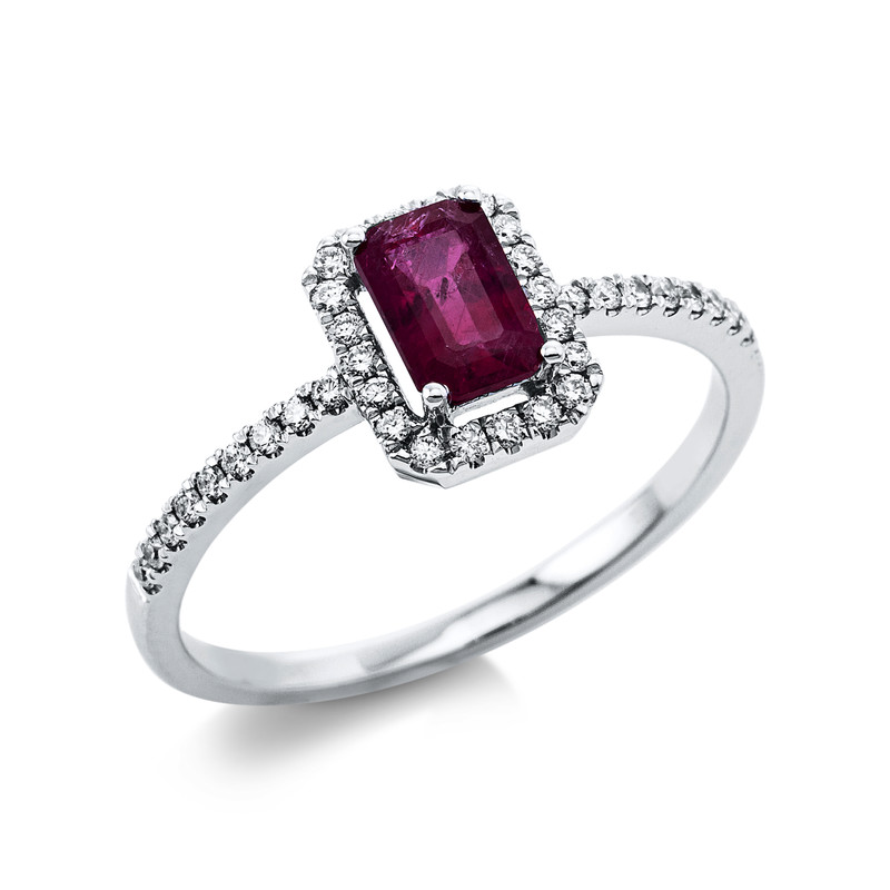 ring 18 kt WG, 38 diamonds 0,19 ct, G-si, 1 ruby 0,63 ct red, h:6,5 mm, w:8,3 mm, width:54
