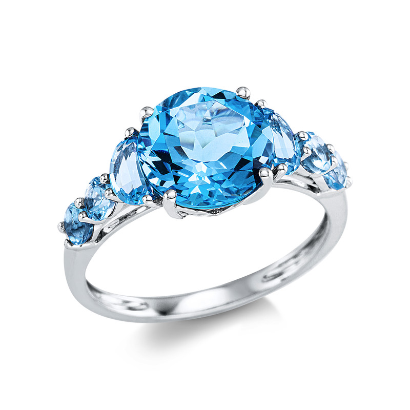 ring 18 kt WG, 2 topaz 0,40 ct blue, 1 topaz 3,40 ct blue, 4 topaz 0,60 ct blue, h:20,1 mm, w:9,1 mm, width:54