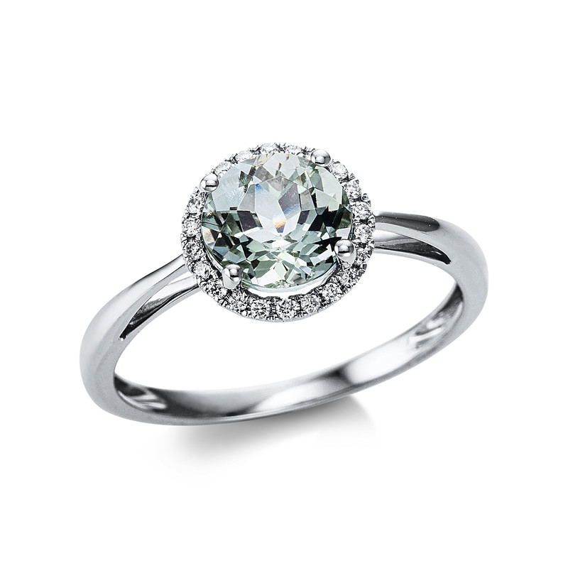 ring 18 kt WG, 22 diamonds 0,10 ct, G-si, 1 amethyst 1,20 ct green, h:9,0 mm, w:9,0 mm, width:54