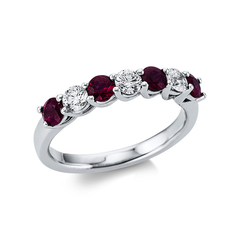 ring 18 kt WG, 3 diamonds 0,44 ct, G-vsi, 4 rubies 0,75 ct red, w:3,5 mm, width:54