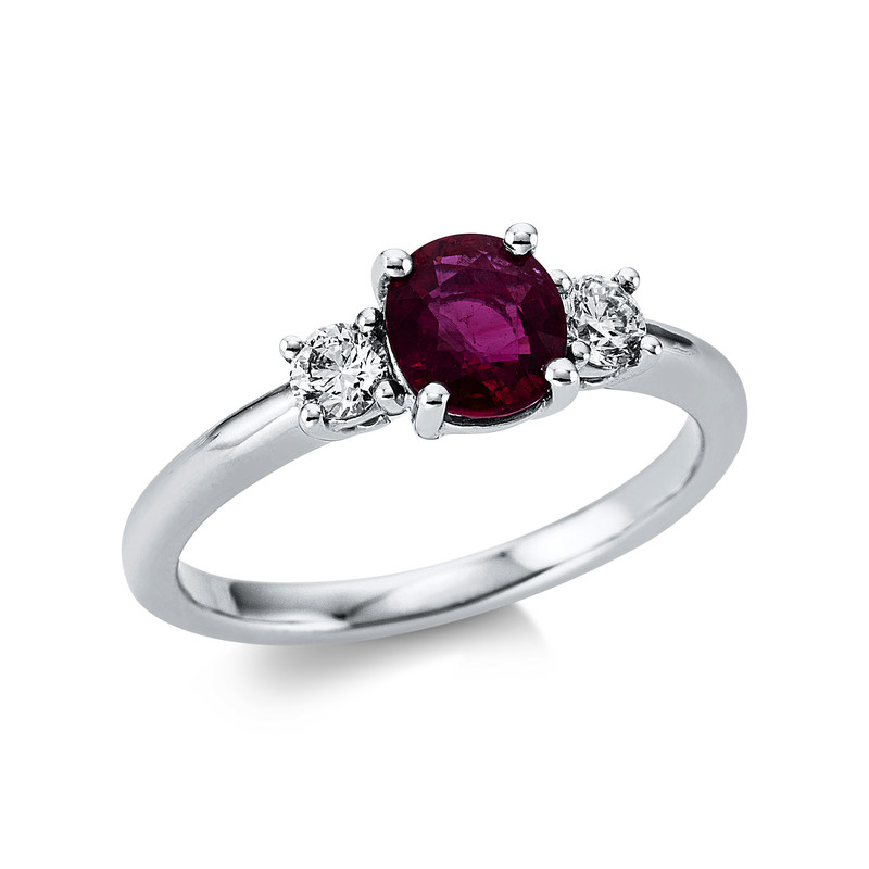 ring 18 kt WG, 2 diamonds 0,26 ct, G-vsi, 1 ruby 1,08 ct red, width:54
