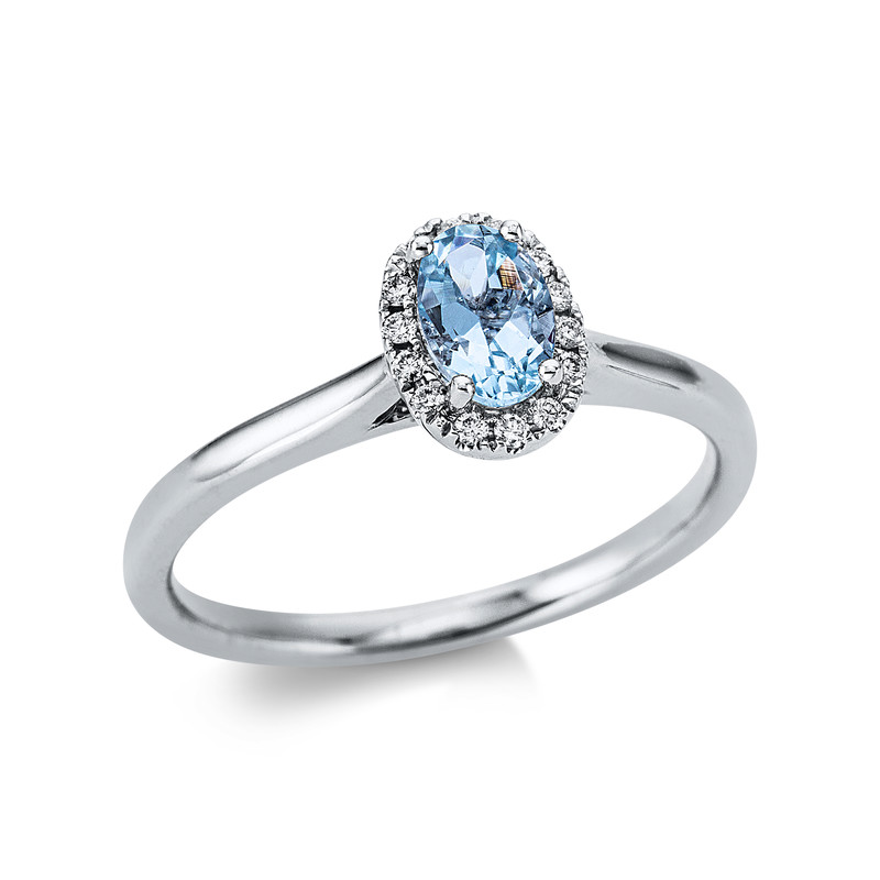 ring 18 kt WG, 14 diamonds 0,07 ct, G-si, 1 aquamarine 0,44 ct blue, width:53