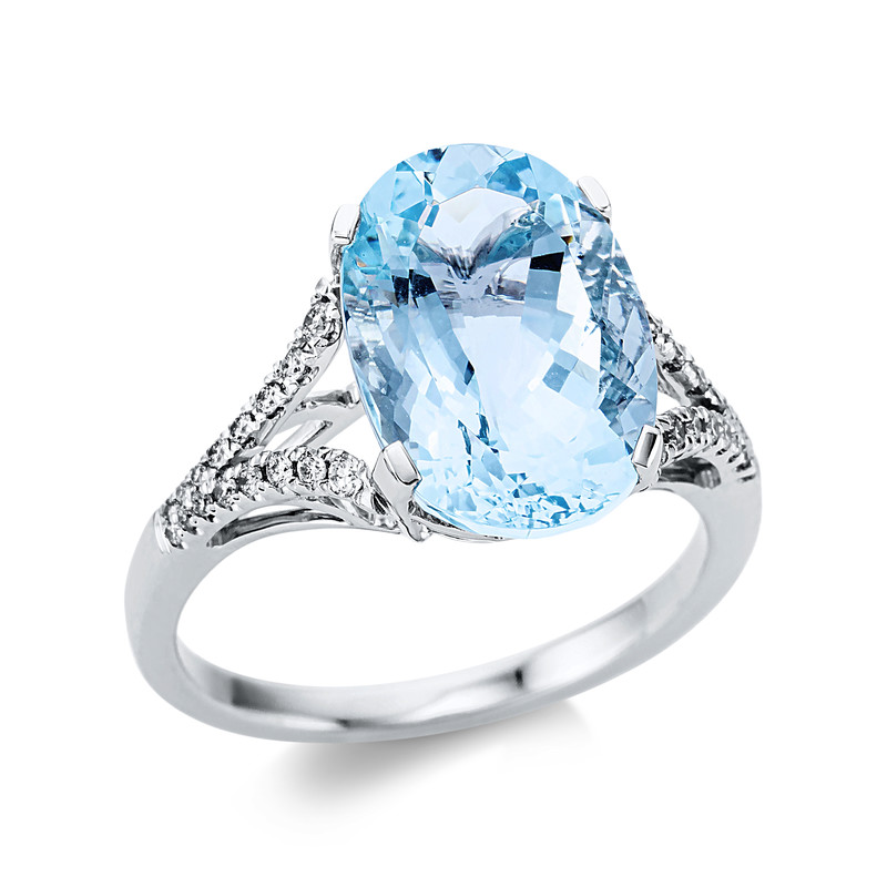 ring 18 kt WG, 32 diamonds 0,20 ct, G-si, 1 aquamarine 5,00 ct blue, width:54