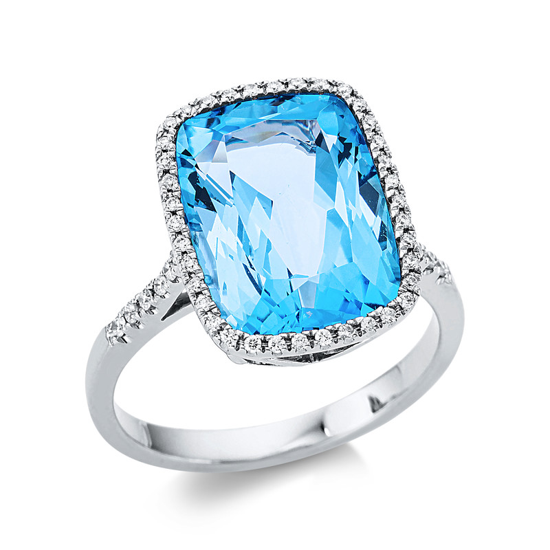 ring 18 kt WG, 50 diamonds 0,20 ct, G-si, 1 blue topaz 8,90 ct blue, width:54