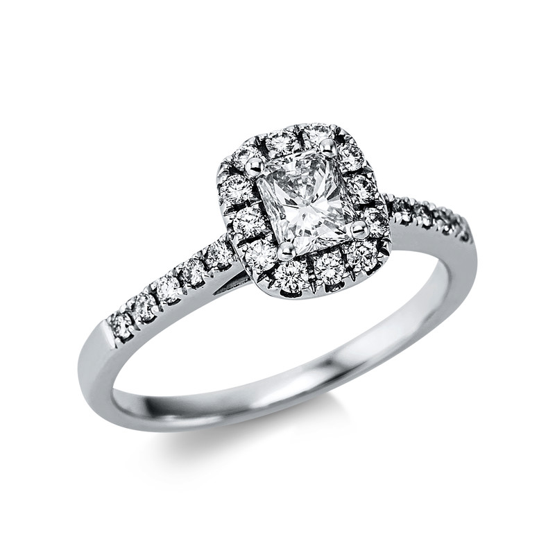 ring 18 kt WG, 22 diamonds 0,26 ct, G-vsi, 1 radiant 0,48 ct, G-vsi, width:54