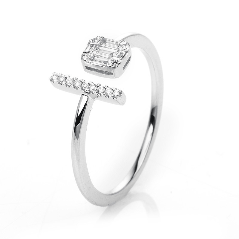 ring 18 kt WG, 13 diamonds 0,05 ct, G-si, 5 baguette 0,10 ct, G-si, w:9,3 mm, width:54