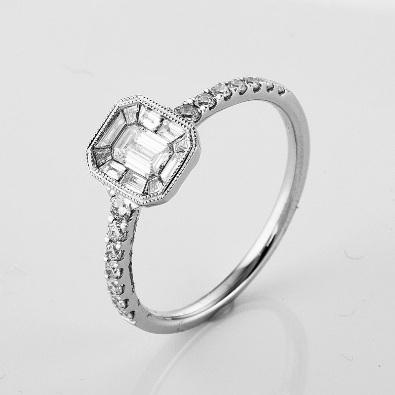 ring 18 kt WG, 11 baguette 0,50 ct, G-si, 14 diamonds 0,26 ct, G-si, width:54