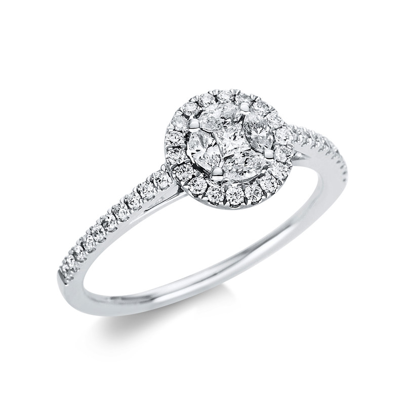 ring 18 kt WG, 1 princess 0,04 ct, G-si, 4 marquise 0,23 ct, G-si, 38 diamonds 0,25 ct, G-si, h:8,3 mm, width:54
