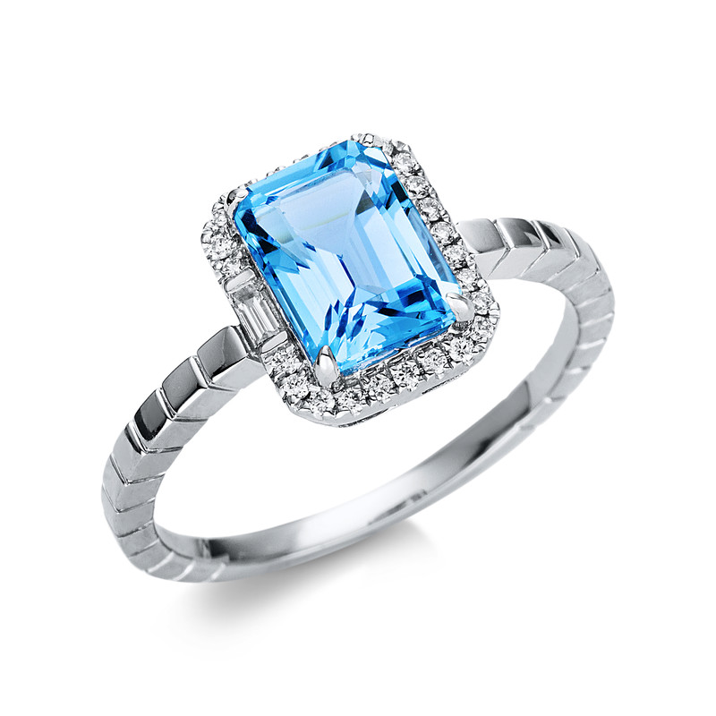 ring 18 kt WG, 1 baguette 0,02 ct, G-si, 25 diamonds 0,09 ct, G-si, 1 topaz 1,93 ct blue, width:54