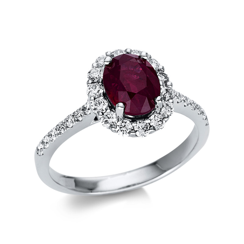 ring 18 kt WG, 28 diamonds 0,58 ct, G-vsi, 1 ruby 2,07 ct red, width:53