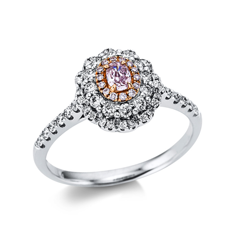 ring 18 kt WG+RG, AGL Cert., 48 fanta cut 0,40 ct, G-si, 1 oval 0,12 ct, pink, 14 diamonds 0,04 ct, pink, width:51