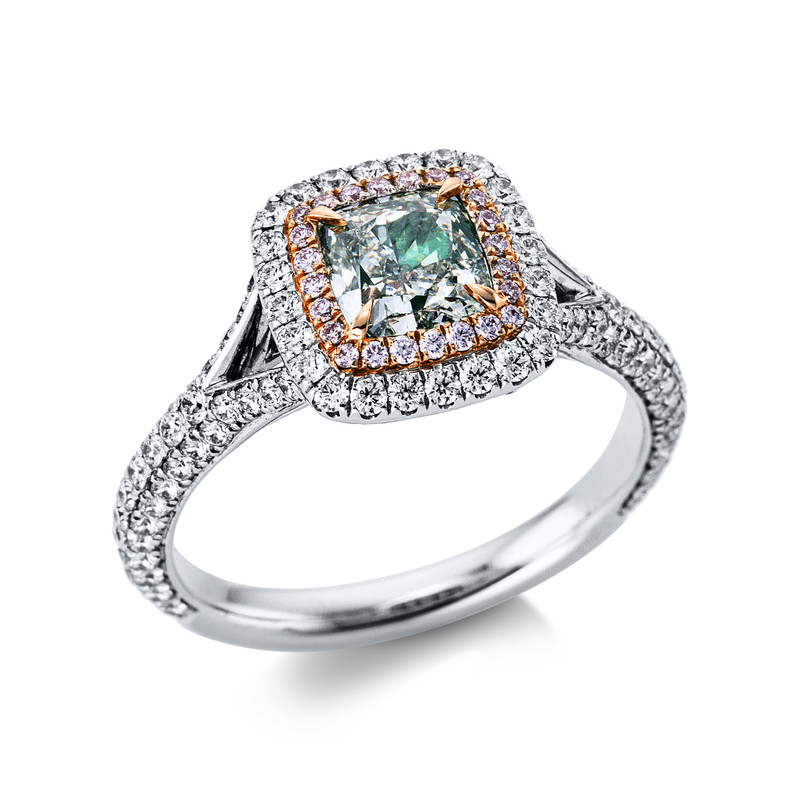 ring 18 kt WG+RG, 24 diamonds 0,09 ct, pink-si, 1 cushion 0,94 ct, green-si, 150 diamonds 0,73 ct, F-vsi/si, width:53