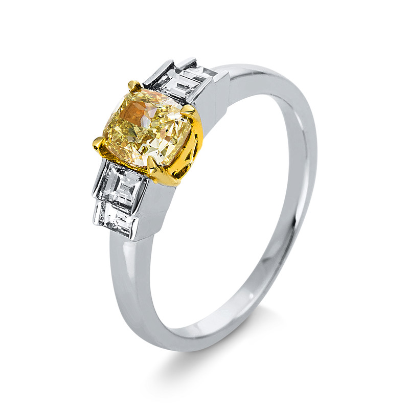 ring 18 kt WG+YG, GIA 1263412307, 4 baguette 0,32 ct, G-si, 1 cushion 1,00 ct, yellow, width:54
