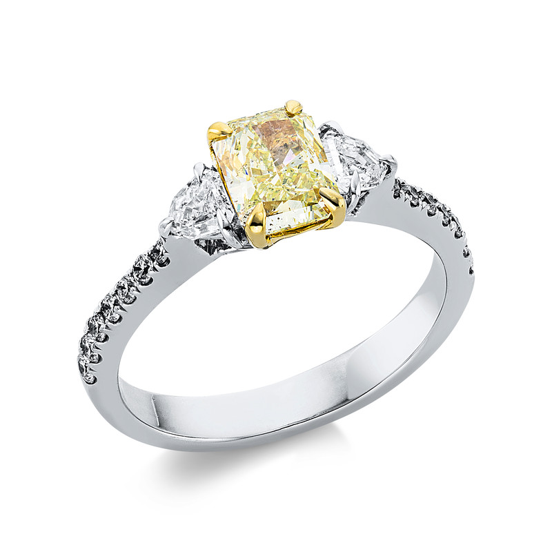 ring 18 kt WG+YG, GIA 5211532275, 2 fanta cut 0,33 ct, D-si, 1 radiant 1,00 ct, yellow-pi, 14 diamonds 0,18 ct, G-vsi, width:53