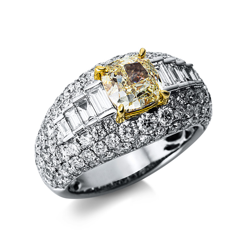 ring 18 kt WG+YG, GIA2205343389, 8 baguette 0,51 ct, G-si, 1 cushion 2,01 ct, G-si, 112 diamonds 2,87 ct, G-si, width:54