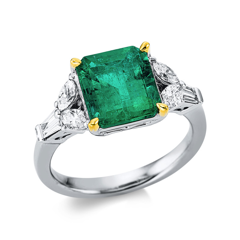 ring 18 kt WG+YG, 4 marquise 0,38 ct, G-si, 4 baguette 0,14 ct, G-si, 1 emerald 3,27 ct green, width:54