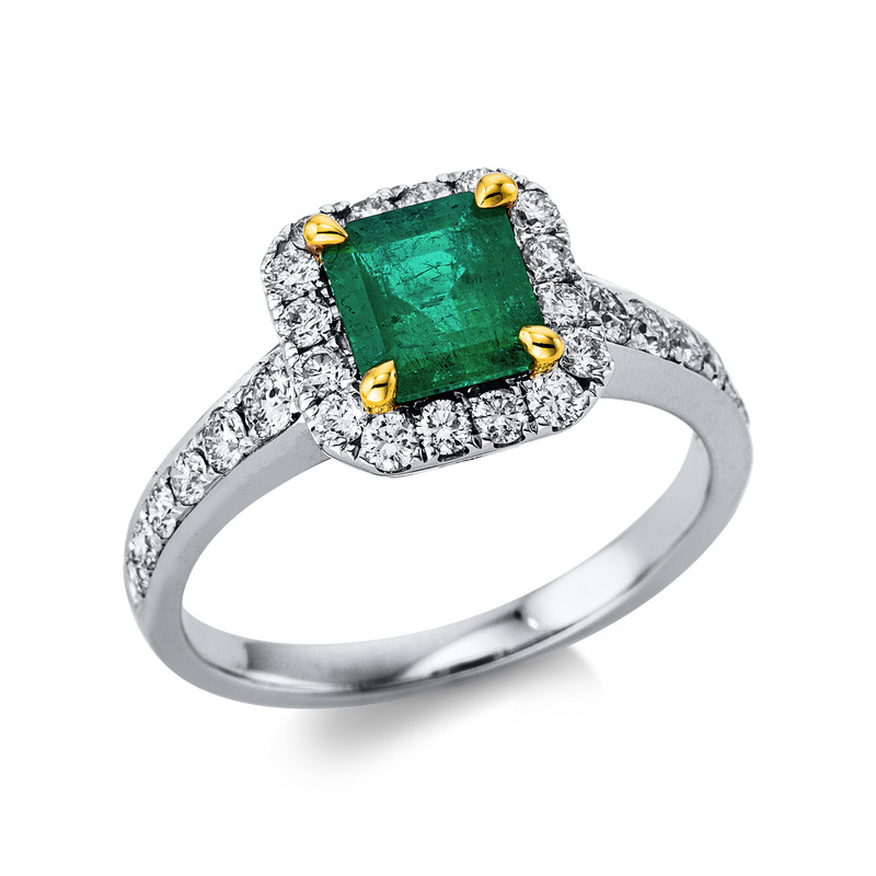 ring 18 kt WG+YG, 28 diamonds 0,68 ct, G-si, 1 emerald 1,03 ct green, width:54