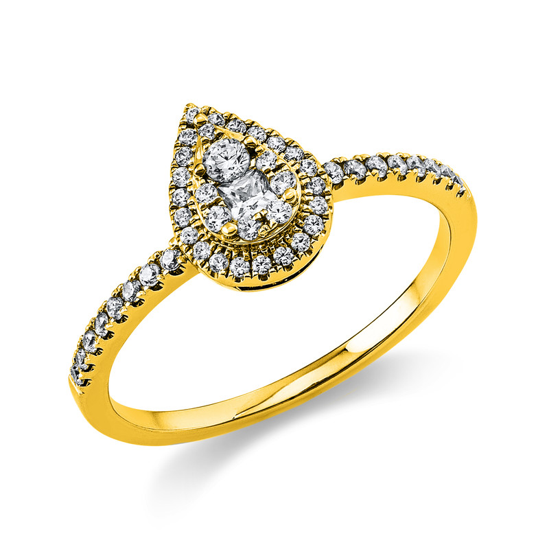 ring 18 kt YG "pear", 1 princess 0,06 ct, G-si, 46 diamonds 0,26 ct, G-si, width:58