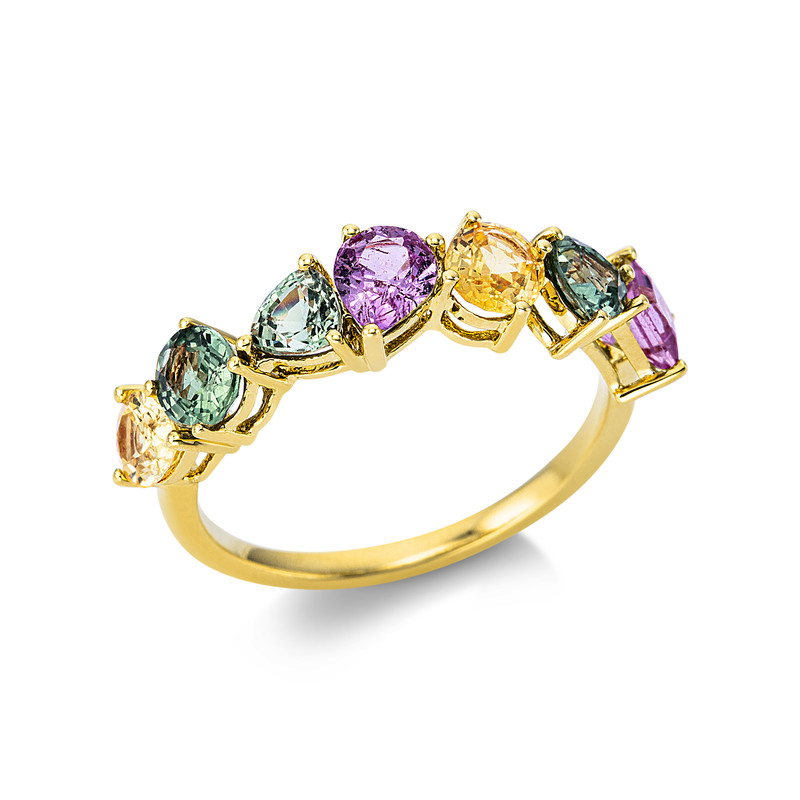 ring 18 kt YG, 7 sapphire 2,45 ct multicolor, w:5,7 mm, width:53