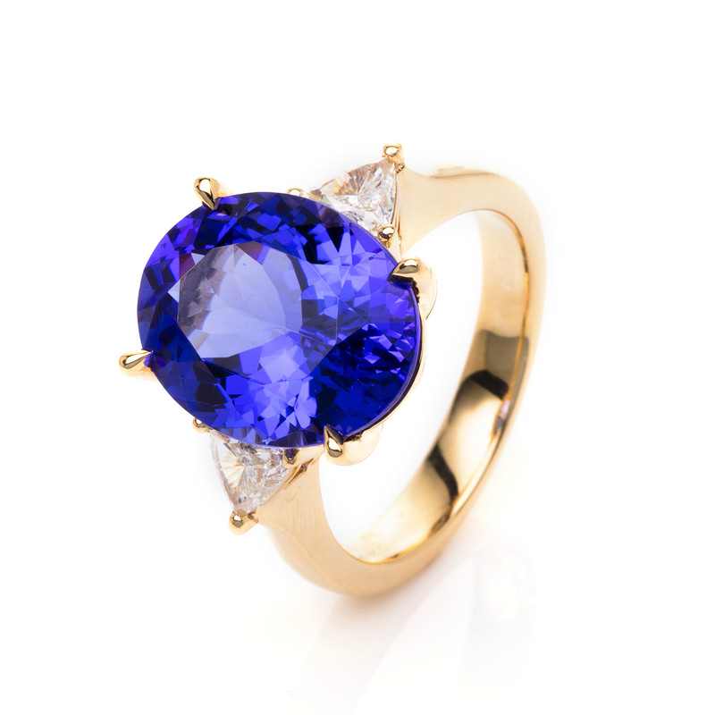 ring 18 kt YG, 2 triangle 0,62 ct, G-si, 1 tanzanite 9,60 ct blue, width:54