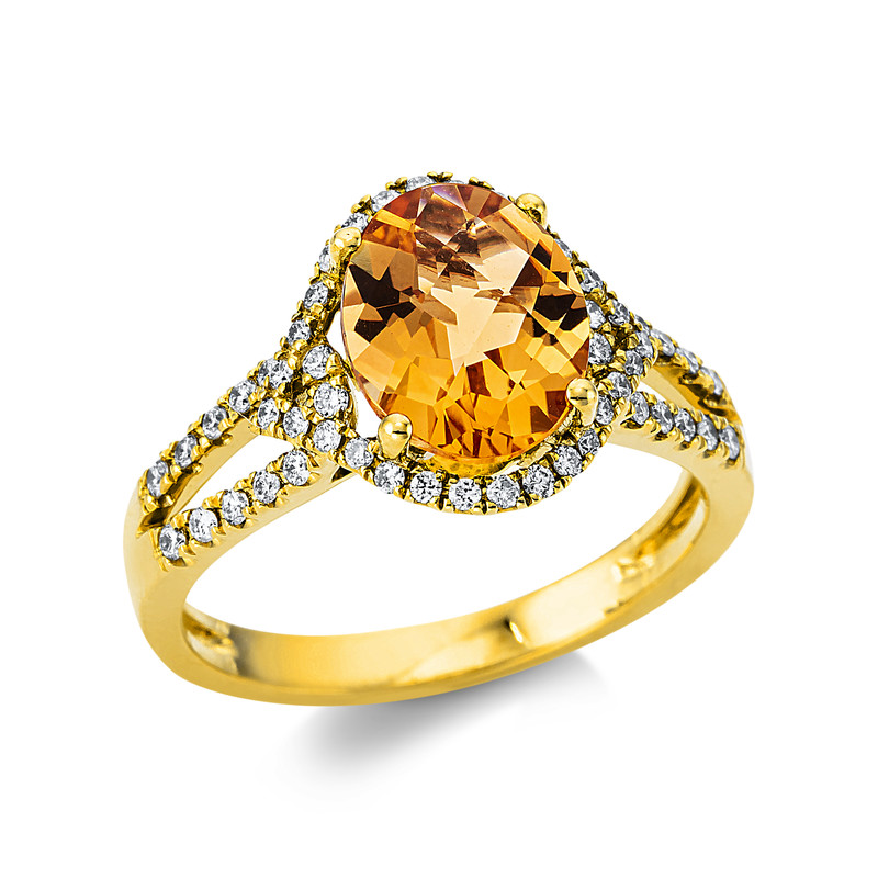 ring 18 kt YG, 52 diamonds 0,35 ct, G-si, 1 citrine 2,00 ct yellow, width:54
