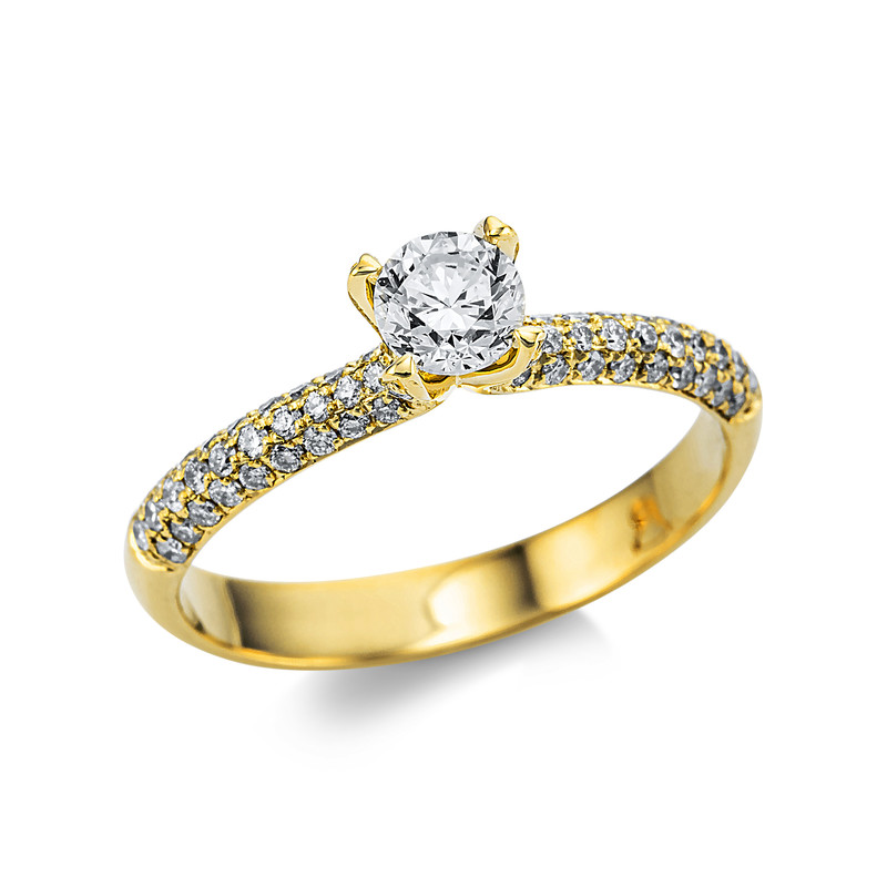 ring 18 kt YG, 1 diamond 0,40 ct, G-si, 72 diamonds 0,31 ct, G-si, h:4,7 mm, w:5,2 mm, width:56