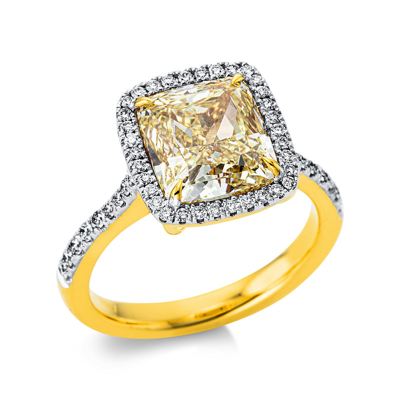 ring 18 kt YG+WG, GIA 6214393590, 1 cushion 4,05 ct, yellow-vsi, 52 diamonds 0,35 ct, F-vsi, width:53