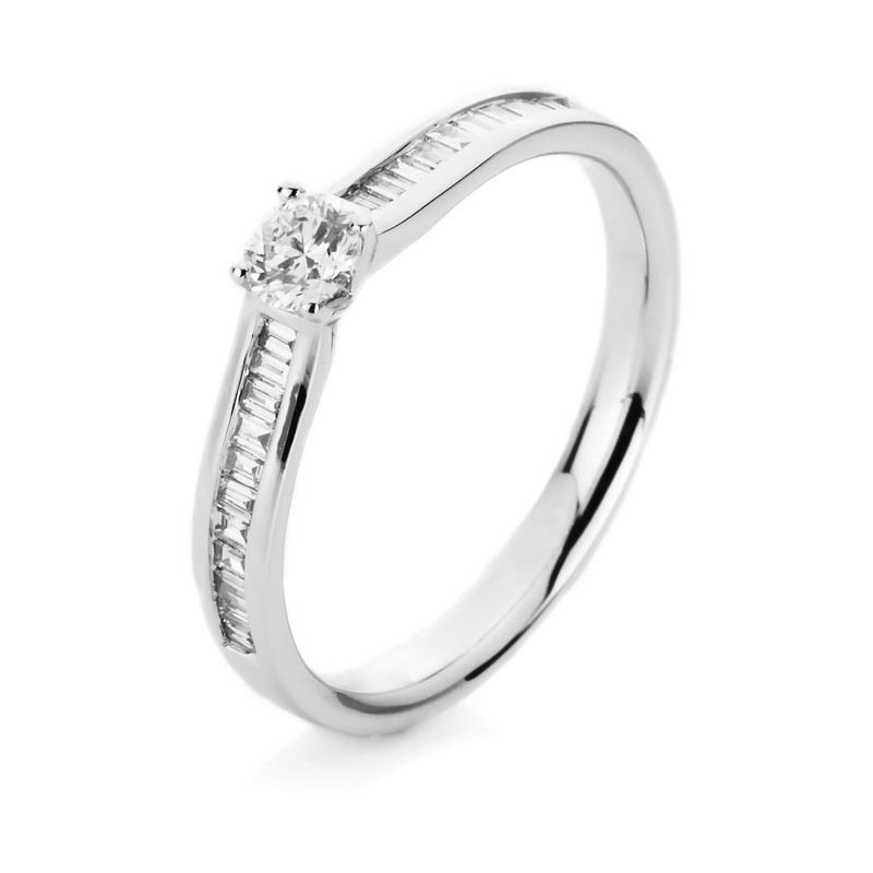 ring 4 prongs 14 kt WG, 22 baguette 0,19 ct, G-si, 1 diamond 0,22 ct, G-si, width:54